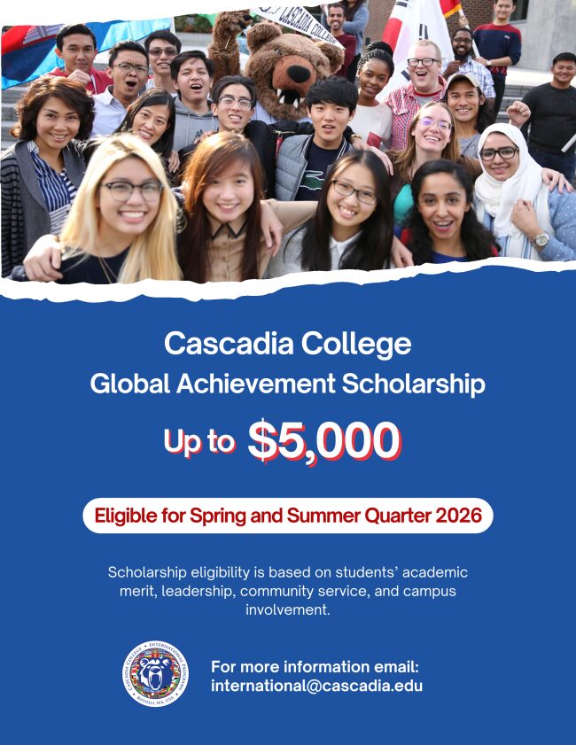 Global Achievement Scholarships – International Diversity Scholarship(インターナショナル・ダイバーシティ・スカラシップ)は、新たに入学する留学生を歓迎し、留学生がカスケーディアのコミュニティの活気ある、そして今後ますます成長していく重要な一員となれるよう支援するために設けられました。奨学金額は1件につき2,000ドルです。