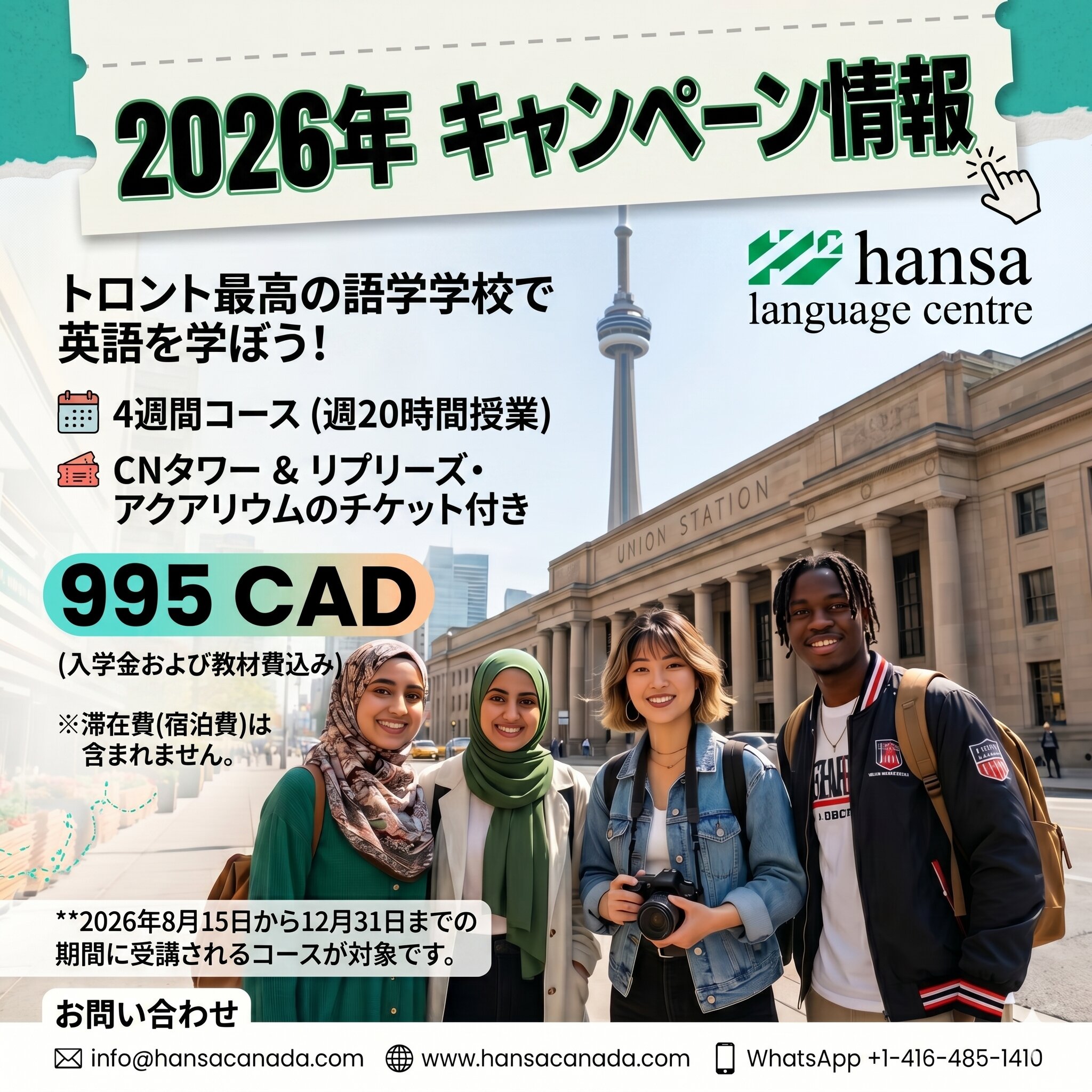 Hannsa Language Centre(ハンザ)は、留学手続き手数料無料の対象校です。キャンペーンを適用した留学費用のお見積りをメールにてお送りしますので、お気軽にお問い合わせください。